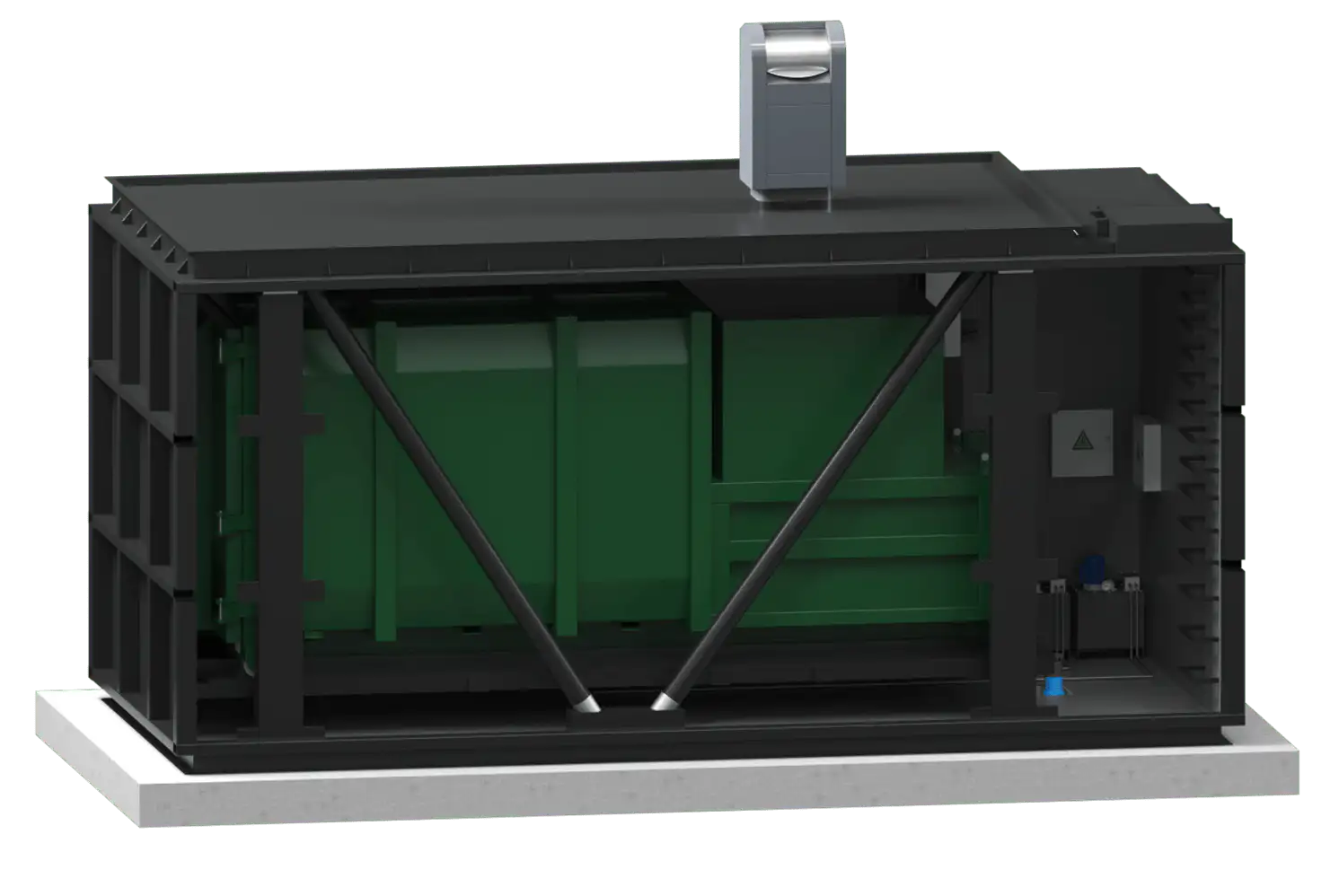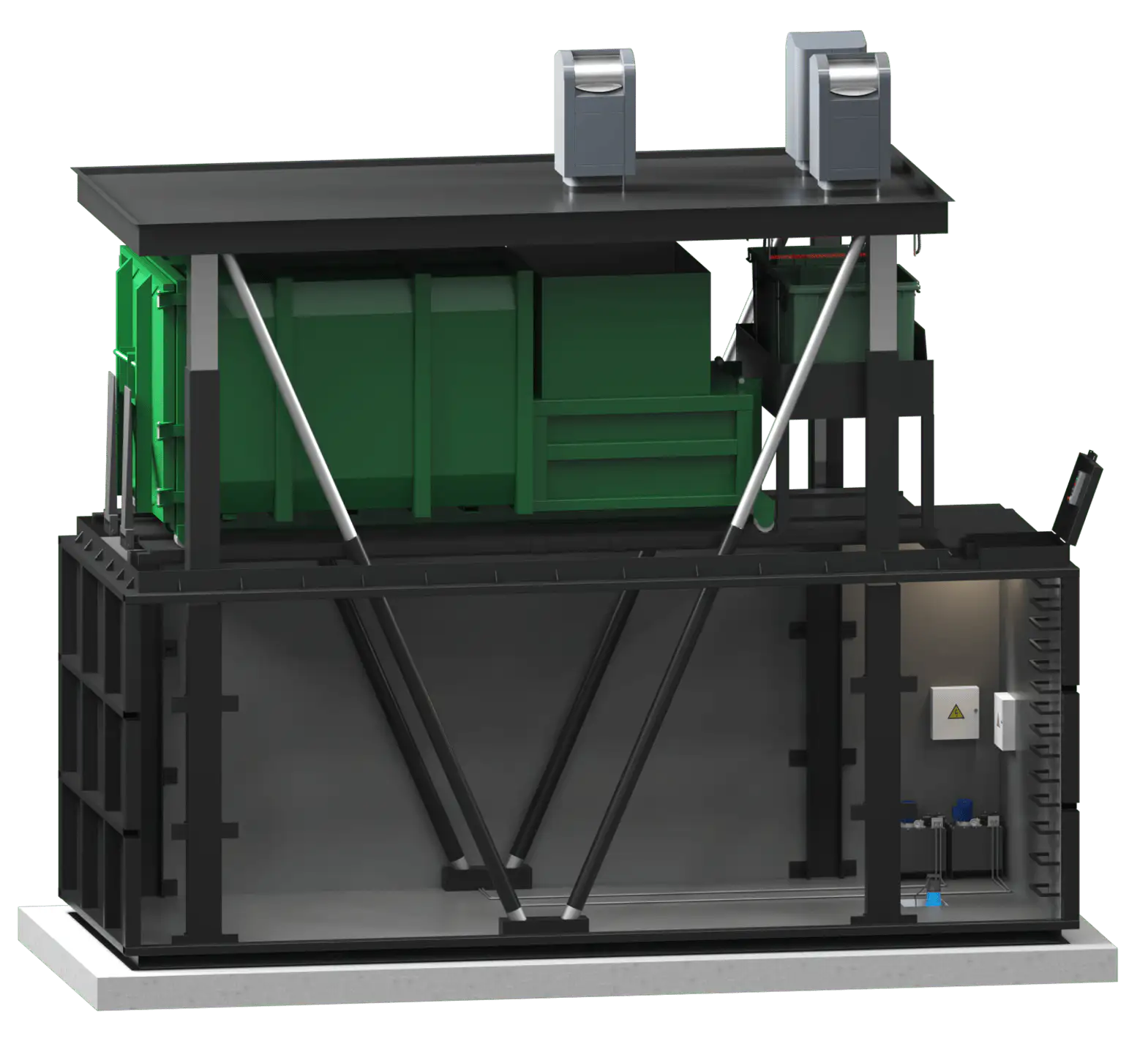 Система PUZER TERRA монтируется в стальном модуле с гидравлическим подъемным механизмом. Отходы поступают через приемный терминал, прессуются и попадают во вместительный контейнер с датчиками наполнения.