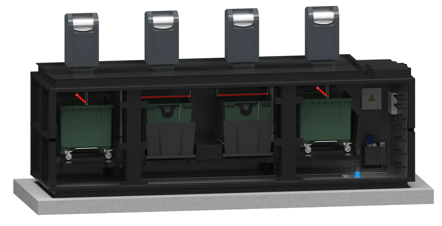 Система решает проблемы традиционных контейнерных площадок: переполнение, неприятные запахи и антисанитария, неэффективное использование пространства, вандализм и сложности раздельного сбора отходов.