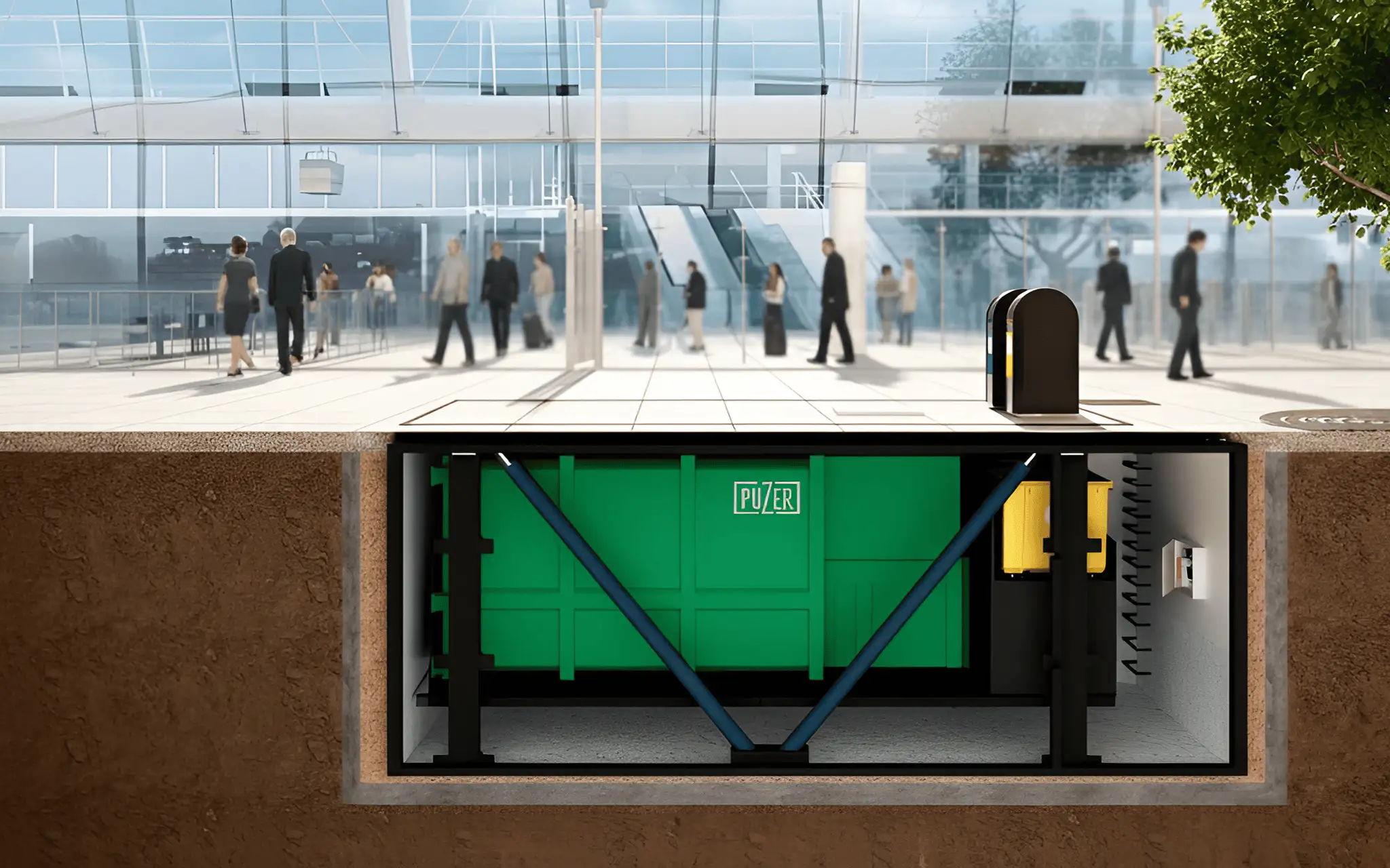 PUZER TERRA — современная подземная система сбора ТБО во дворах и общественных пространствах. Отходы размещаются в герметичном подземном модуле, а на поверхности остаются только функциональные эстетичные приемные терминалы.